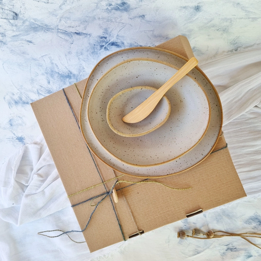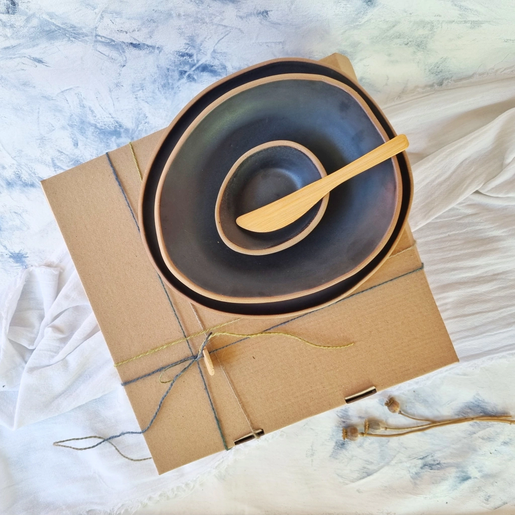 Descubre nuestro BOX PICADA CHICO, el conjunto perfecto para deleitarse con una exquisita variedad de fiambres y quesos. Este elegante set incluye un plato, un cuenco y un cuenquito para dips, junto con un untador de bambú, todo presentado en una hermosa caja lista para regalar.
