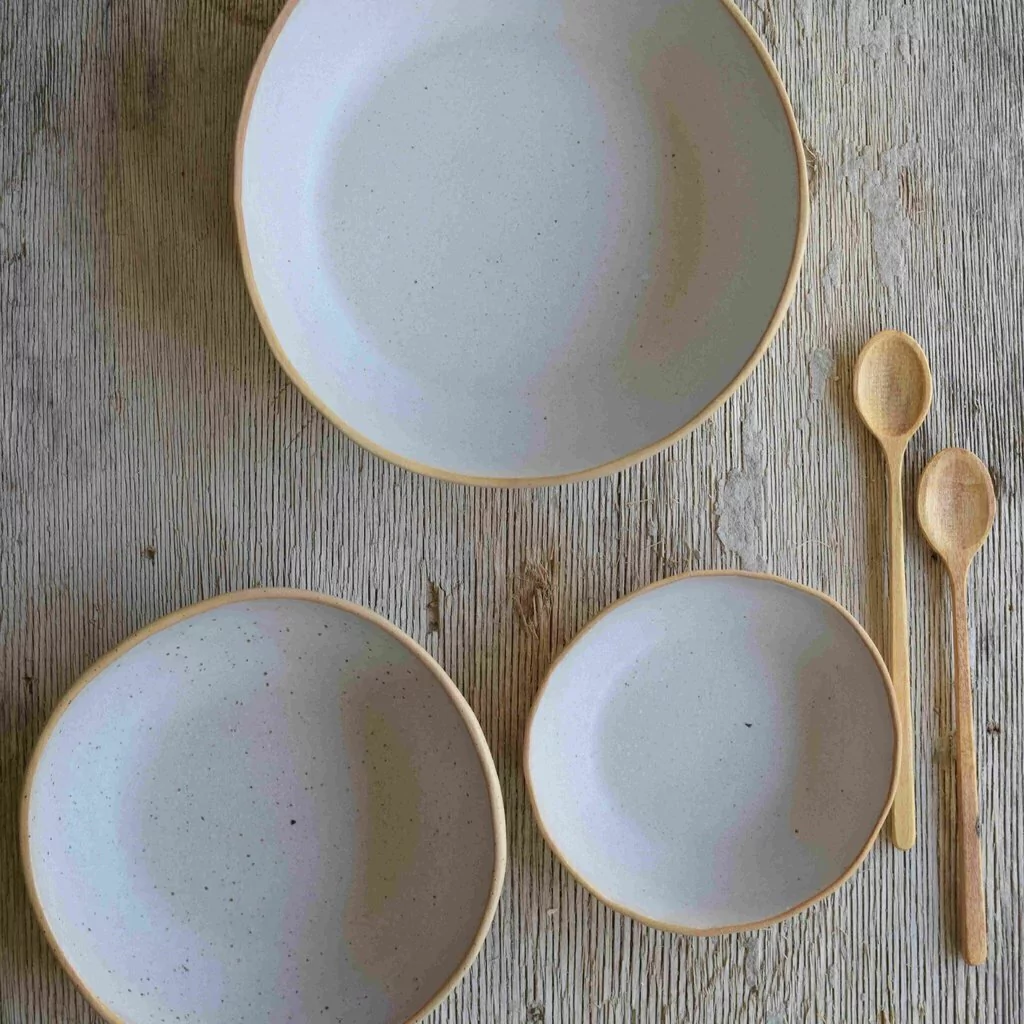 Utilizamos un esmalte blanco ceniza, de aspecto semimate, que hemos desarrollado para el uso de vajilla.