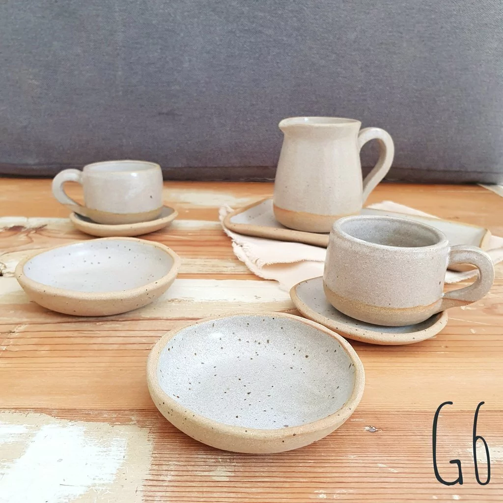 Esta compuesto por 8 piezas. 2 tacitas miniatura con sus platitos, 2 platitos de postre miniatura, 1 jarrita miniatura y 1 mini bandejita.